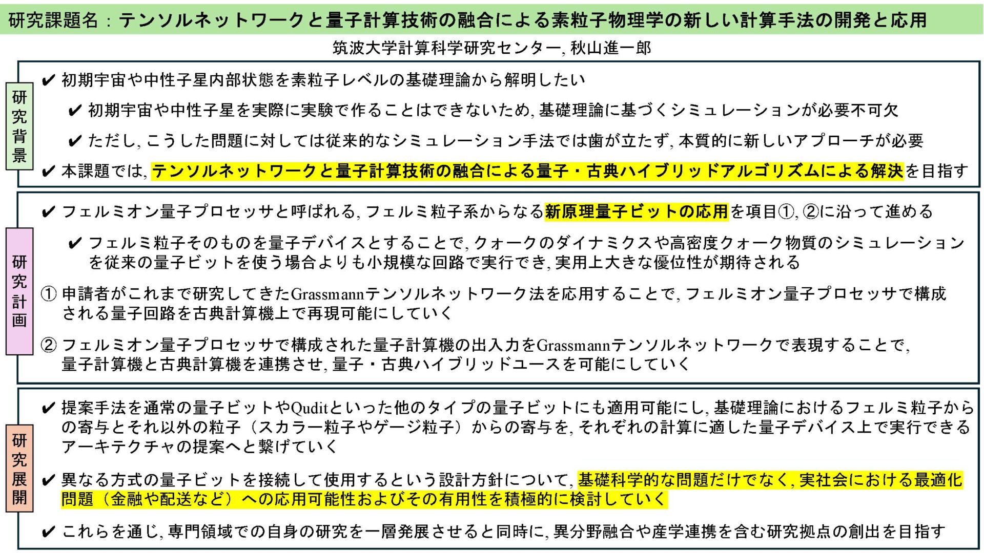 私は、テンソルネットワークと呼ばれる計算手法を活用し、素粒子物理学の研究に取り組んでいます。素粒子物理学の数値計算では、モンテカルロ法と呼ばれる方法が標準的で、これまでに多くの重要な研究成果がもたらされてきました。その一方で、モンテカルロ法ではどうしても計算することが難しい問題も数多く残されています。その筆頭となっている難問は、初期宇宙や中性子星の理解に欠かせない、有限温度・密度の量子色力学(QCD)という理論を解き明かすことです。この研究では、テンソルネットワーク、量子計算、機械学習といった、モンテカルロ法とは異なる計算原理に基づく手法の研究・開発を進めることで、素粒子物理学における未踏の研究領域を開拓していくことを目指しています。