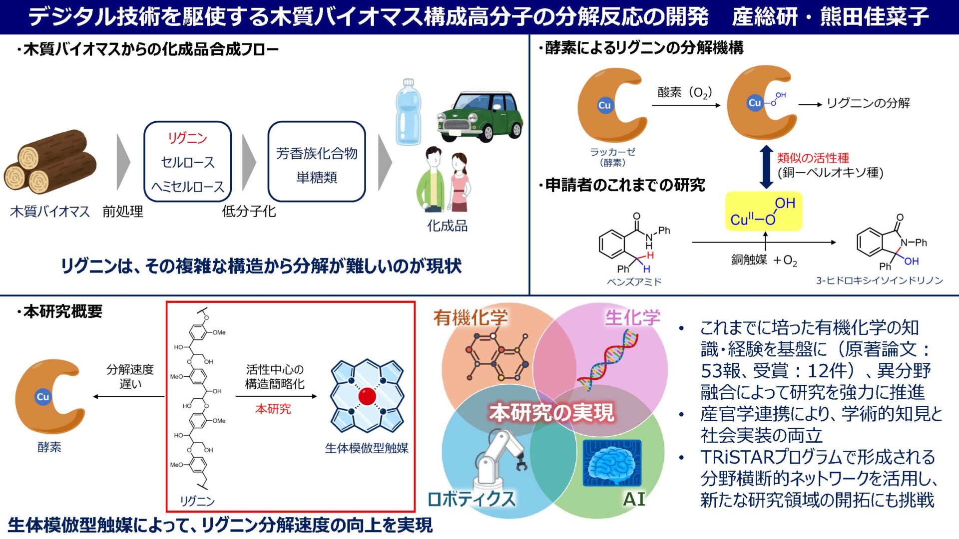 本研究は、木質バイオマス由来の再生可能資源の中でも有効利用が進んでいないリグニンに着目し、その効率的な分解技術の開発を目的とする。リグニンは複雑で分解困難な構造を有するため、資源循環利用における大きな課題となっている。そこで本研究では、有機化学・生化学・情報科学を融合させ、リグニン分解酵素の中心構造を簡略化した生体模倣型触媒の設計・合成に取り組む。この触媒を活用することで、従来法では困難であった温和な条件下での高効率な分解を実現し、実用性の高いリグニン分解反応の確立が期待される。