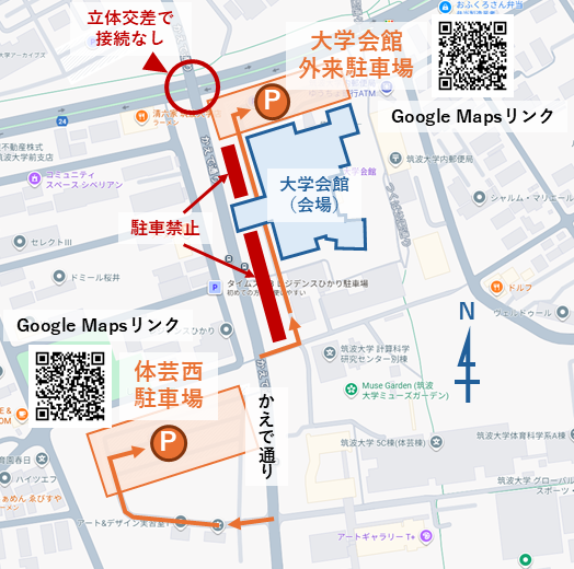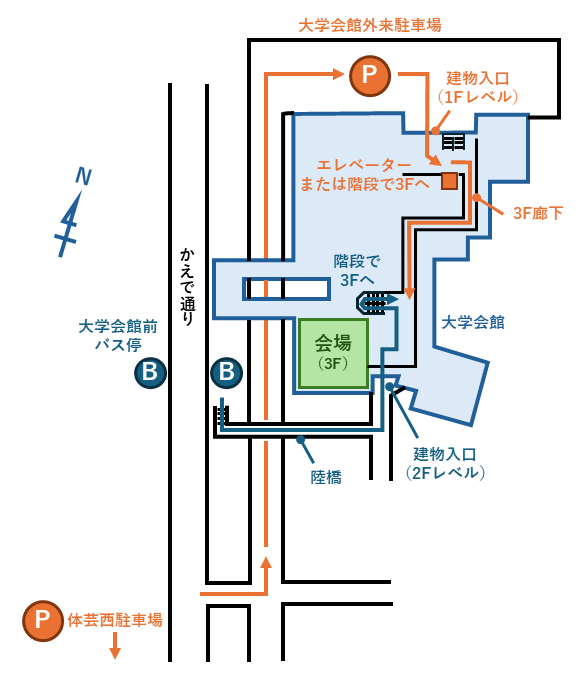 大学会館外来駐車場からの徒歩経路(下図オレンジ線参照):
