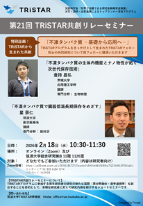 TRiSTARプログラムに参加する若手研究者の研究の新たな展開(異分野融合・産学連携等)を創出することを目的としたTRiSTAR共創リレーセミナーを下記日程で開催いたします。本セミナーシリーズは2025年度よりTRiSTARコンソーシアム機関外にも公開いたしますので、他機関、異分野を含む多くの皆様にご参加いただけますと幸いです。